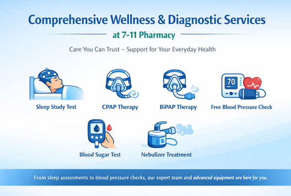 7-11 Pharmacy Raipur offers reliable and high-quality healthcare services designed for every family. We provide free blood pressure checks, blood sugar testing, oxygen level monitoring, nebulizer treatments, and complete first-aid support. Our fast and FREE home delivery service brings genuine medicines to your doorstep across Raipur, Chhattisgarh.